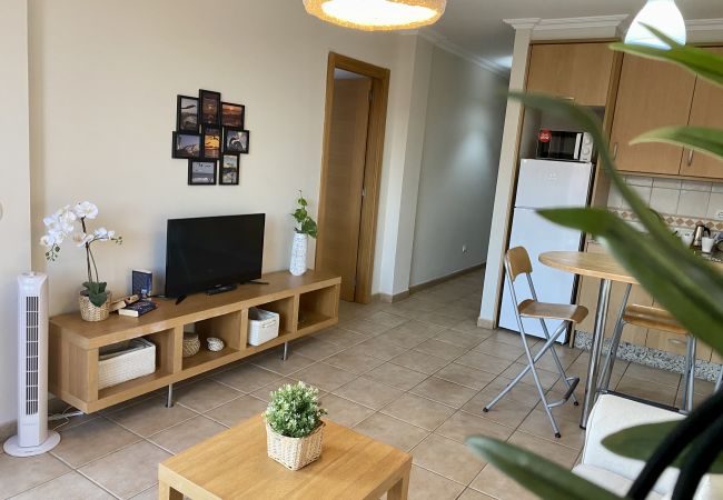 El alojamiento está en un complejo tranquilo , con gran piscina .Dispone de un dormitorio cómodo con gran armario y ventilador , baño con lavadora y salón comedor con cocina bastante bien equipada con todo el menaje necesario para poder tener una estancia muy agradable . También desde el salón tienes salida a un balcón con vistas a la piscina donde podrás desayunar disfrutando del entorno o prepara tus cenas al anochecer de un modo más romántico .