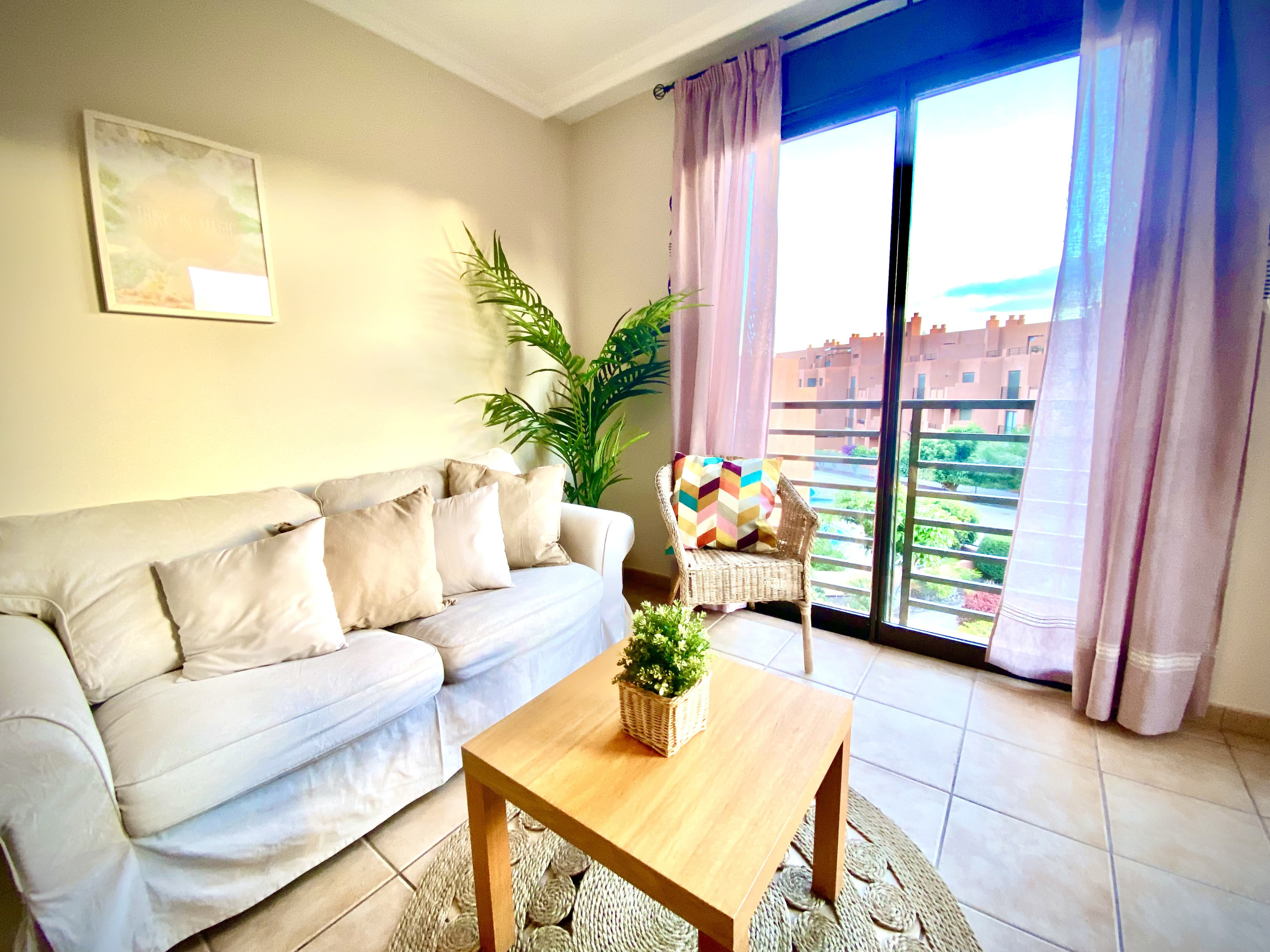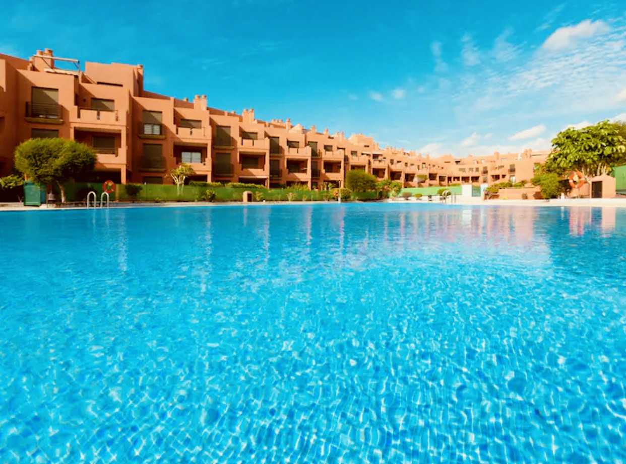 * Terraza con Vistas a la Piscina: Salga desde el salón, el lugar ideal para disfrutar de su café matutino o de cenas románticas al atardecer, con vistas directas a la gran piscina comunitaria del complejo.