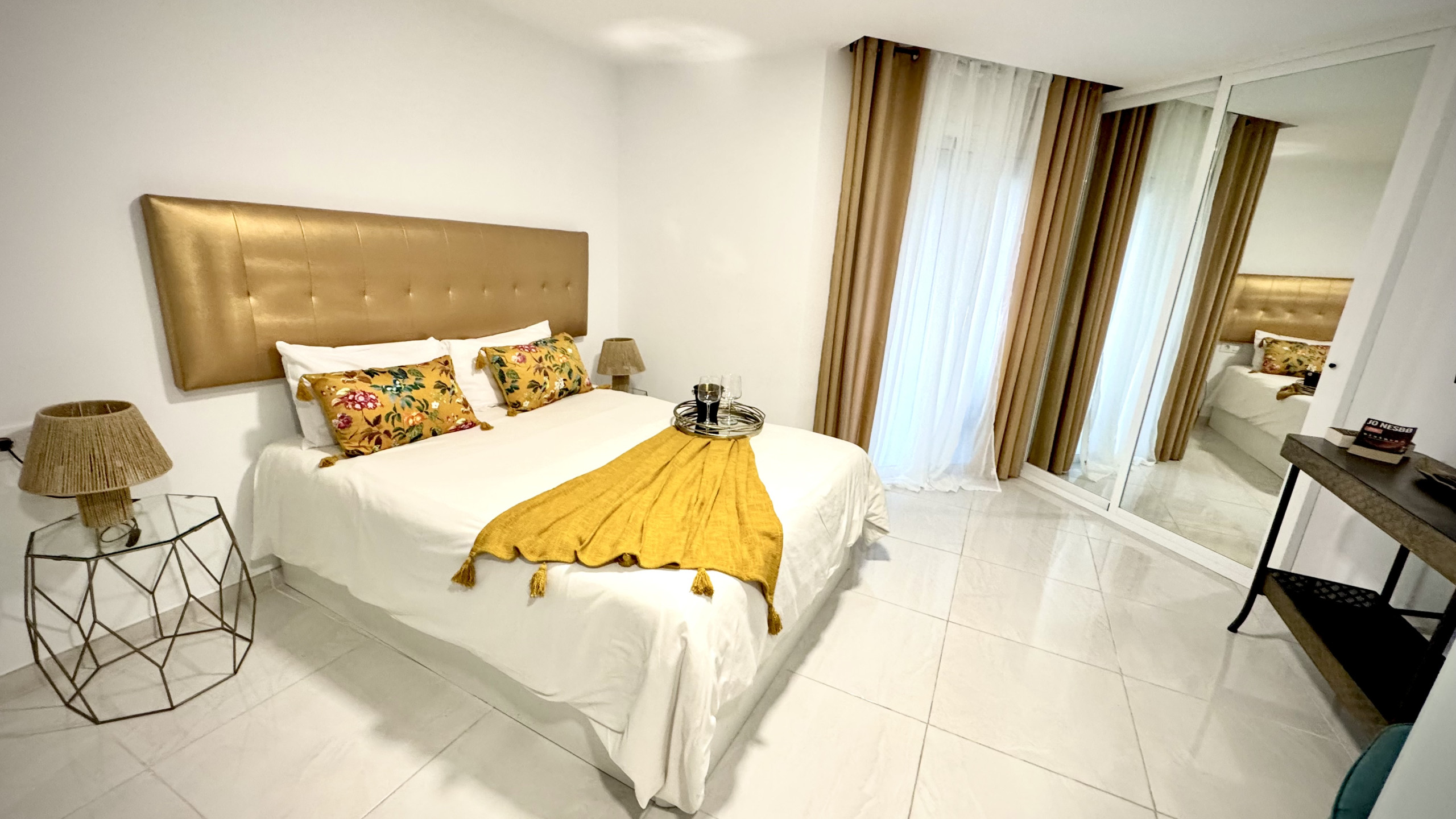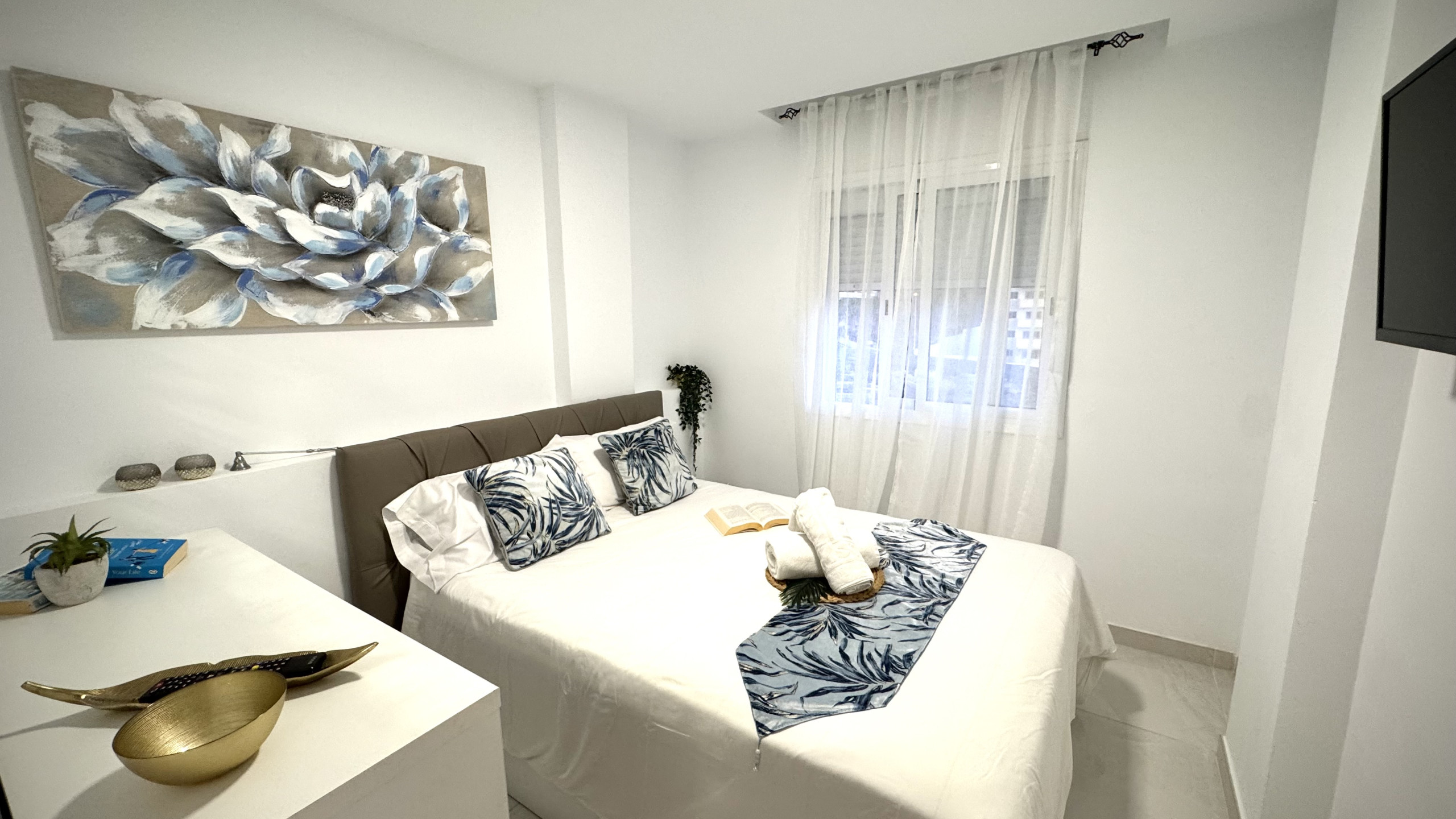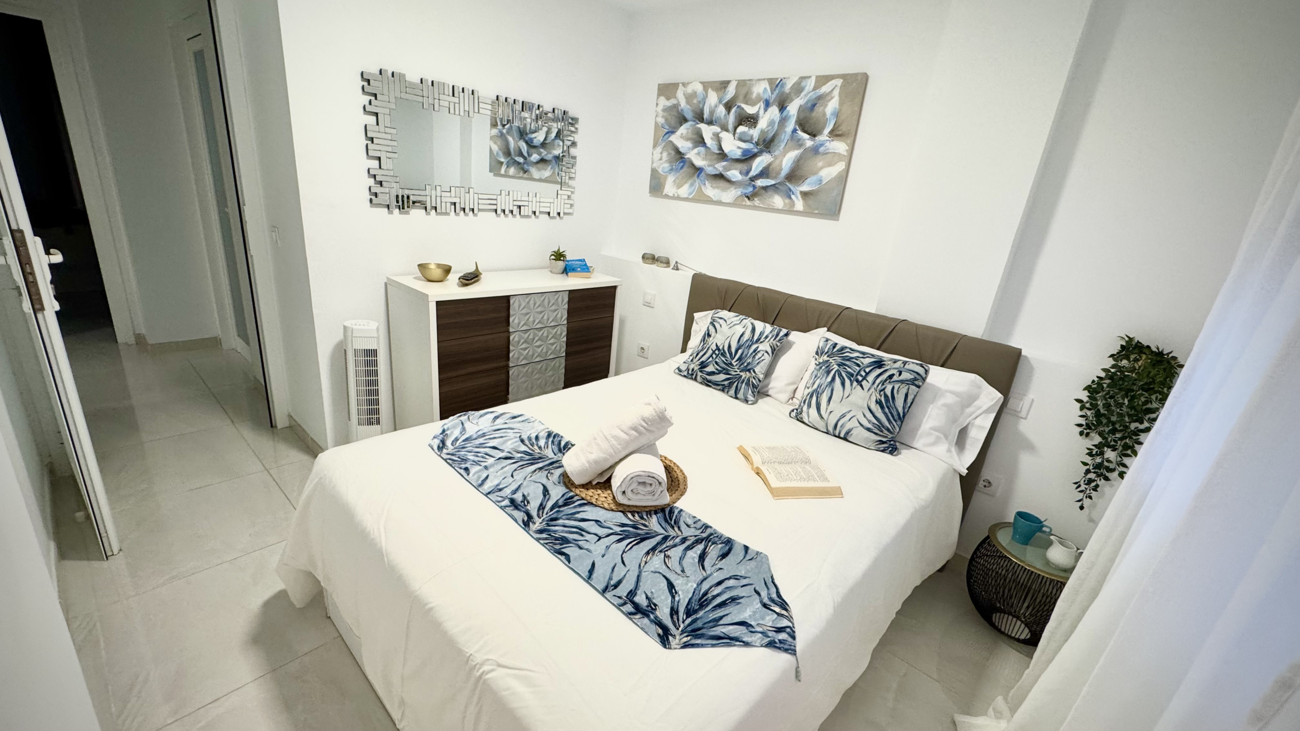 Esta cuidado hasta el mínimo detalle y podrá disfrutar de sus casi 100 metros cuadrados distribuidos en 3 amplios dormitorios con camas muy cómodas equipadas con colchones de alta calidad para poder descansar plácidamente, además tendrán a su disposición diferentes tipos de almohadas ,sabanas y mantas de calidad , en resumen en su habitación tendrán todo lo necesario para un descanso óptimo. Los 3 baños completos tienen secador y plancha de pelo que resulta muy cómodo y práctico para los viajeros que vienen en grupo. En el salón comedor se encontrarán el router para poder usar el wifi gratuito, smart tv con canales vía satélite y acceso directo a una terraza amplia donde podrán desayunar, leer un libro o simplemente relajarse disfrutando de las vistas al mar y piscina. La cocina está equipada con todo tipo de pequeños electrodomésticos , horno , microondas ,lavavajillas y un menaje amplio para disfrutar si desea cocinar durante sus días de estancia.