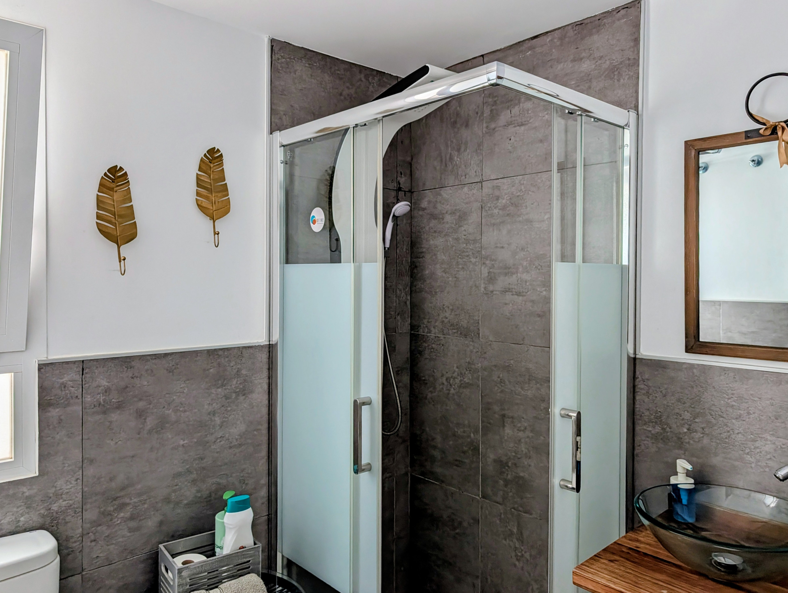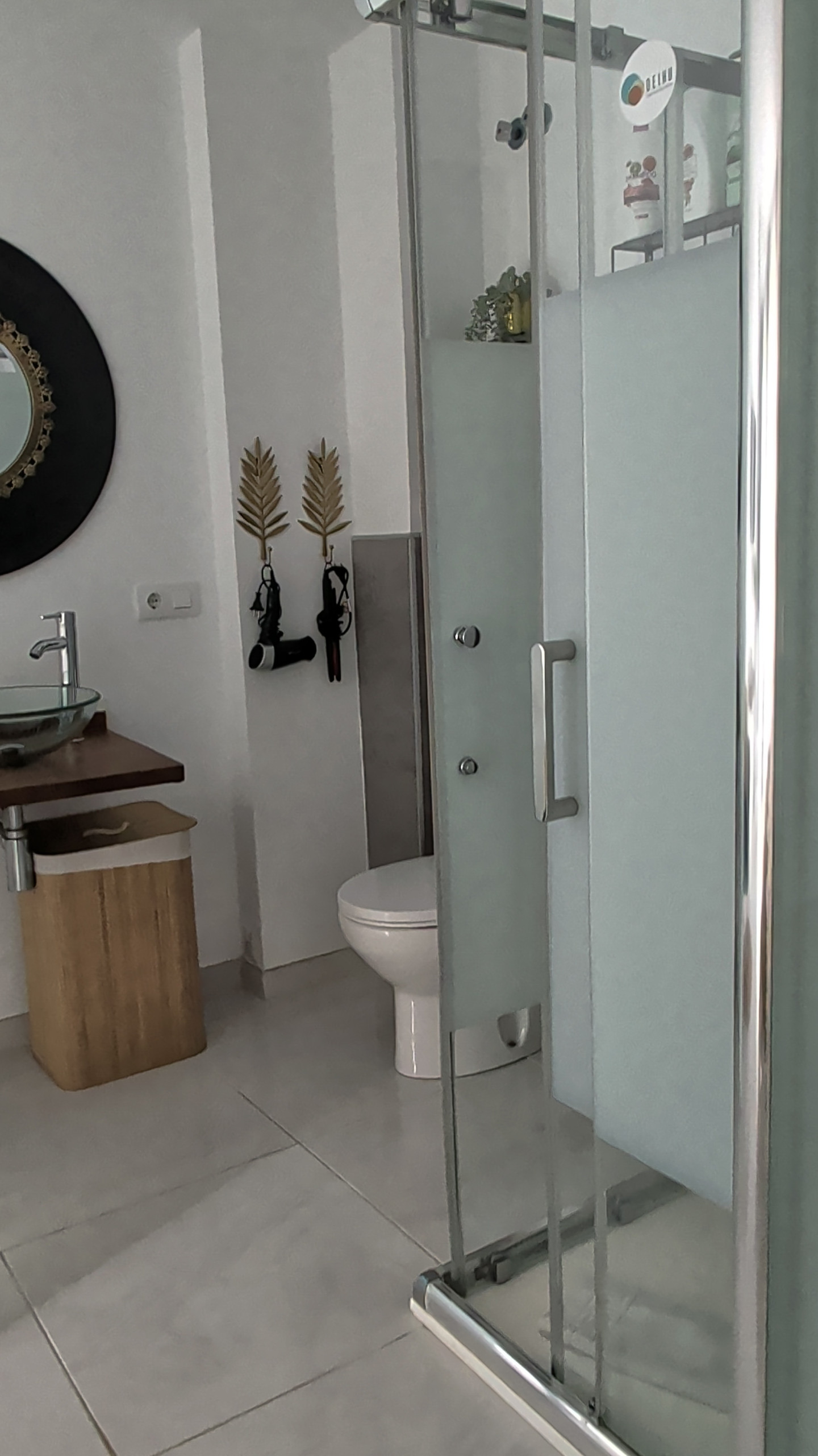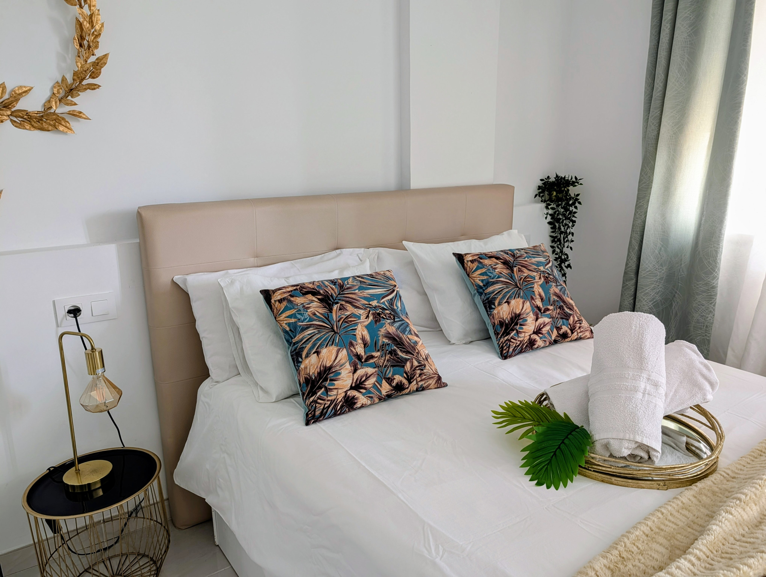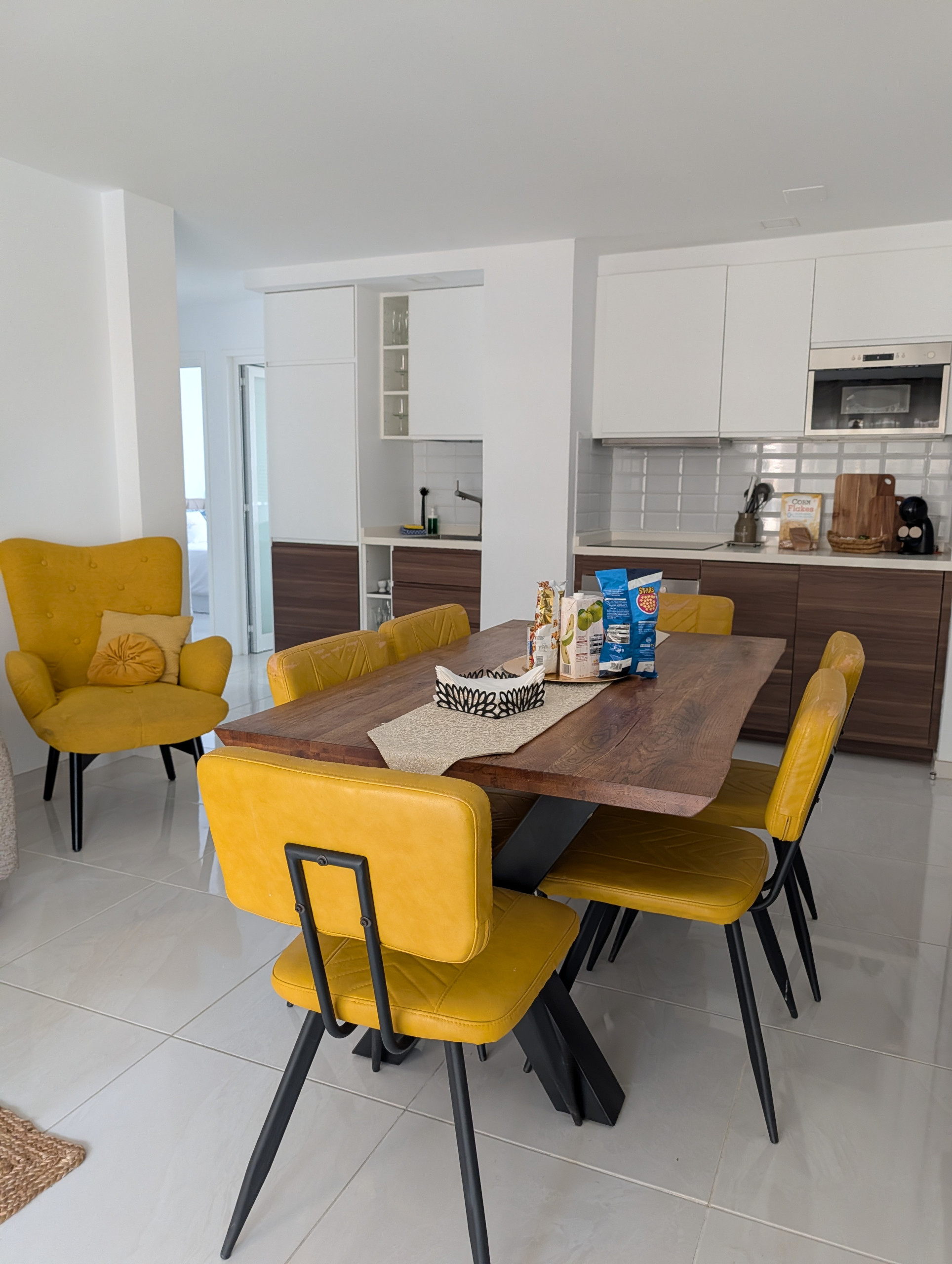 Esta cuidado hasta el mínimo detalle y podrá disfrutar de sus casi 100 metros cuadrados distribuidos en 3 amplios dormitorios con camas muy cómodas equipadas con colchones de alta calidad para poder descansar plácidamente, además tendrán a su disposición diferentes tipos de almohadas ,sabanas y mantas de calidad , en resumen en su habitación tendrán todo lo necesario para un descanso óptimo. Los 3 baños completos tienen secador y plancha de pelo que resulta muy cómodo y práctico para los viajeros que vienen en grupo. En el salón comedor se encontrarán el router para poder usar el wifi gratuito, smart tv con canales vía satélite y acceso directo a una terraza amplia donde podrán desayunar, leer un libro o simplemente relajarse disfrutando de las vistas al mar y piscina. La cocina está equipada con todo tipo de pequeños electrodomésticos , horno , microondas ,lavavajillas y un menaje amplio para disfrutar si desea cocinar durante sus días de estancia.