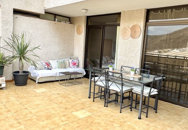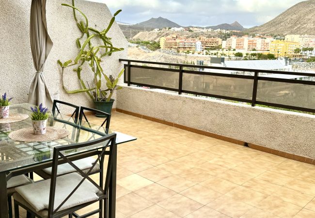 Quieres pasas tus dias en un alojamiento amplio , cómodo y centrico y además disfrutar de su magnífica terraza con vistas al mar y la montaña en el corazón de la playa de los Cristianos ? Este es tu alojamiento perfecto ! .