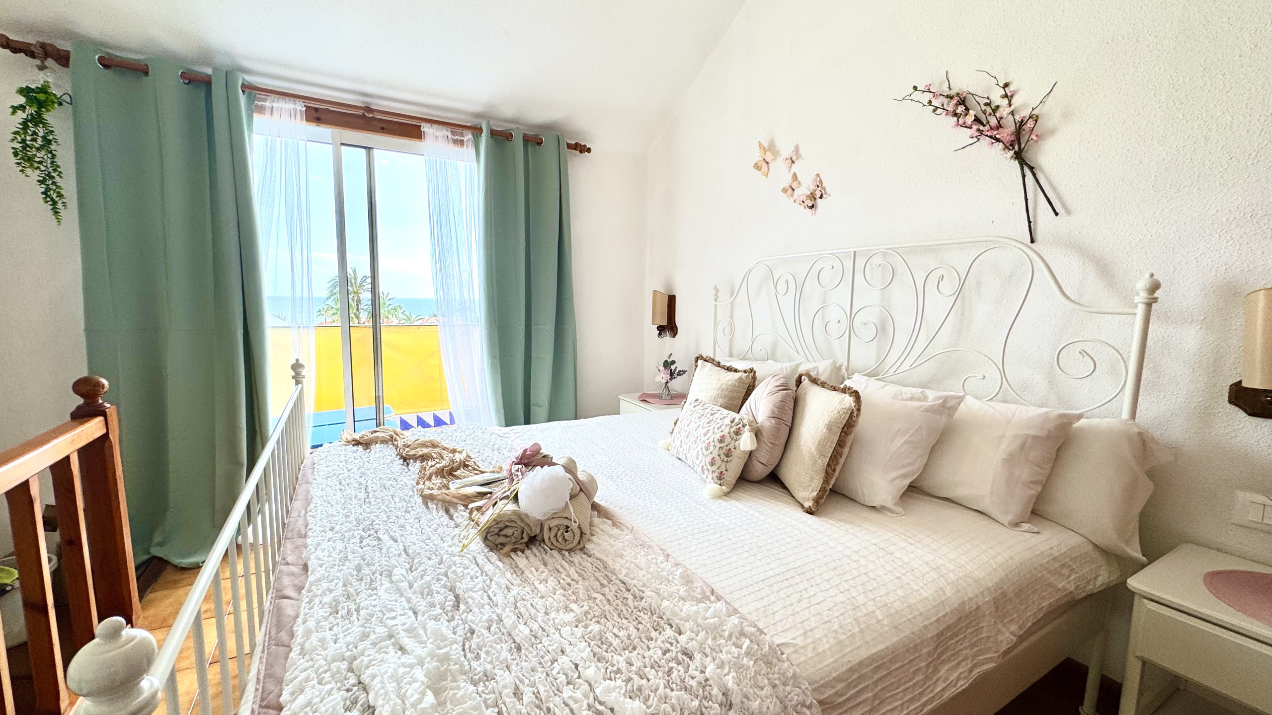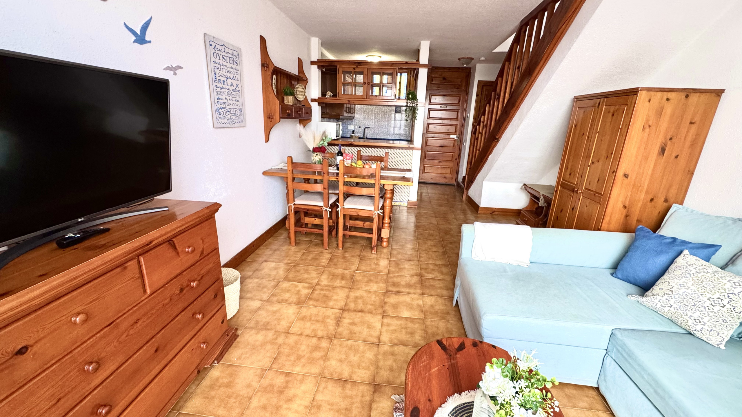 Planta Principal:Un salón acogedor y luminoso equipado con un cómodo sofá-cama de alta calidad y una moderna Smart TV. Desde aquí, se accede a la primera terraza privada, el rincón perfecto para su café matutino mientras contempla el océano.