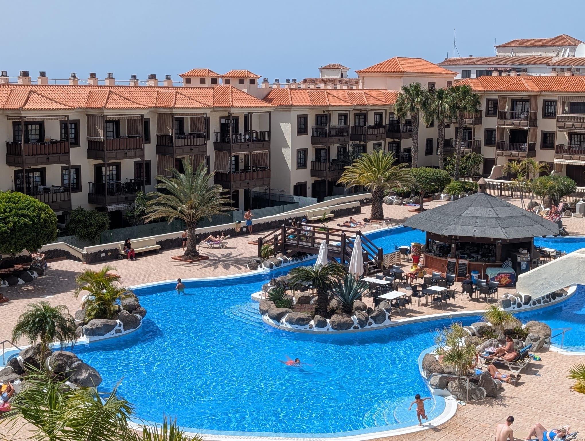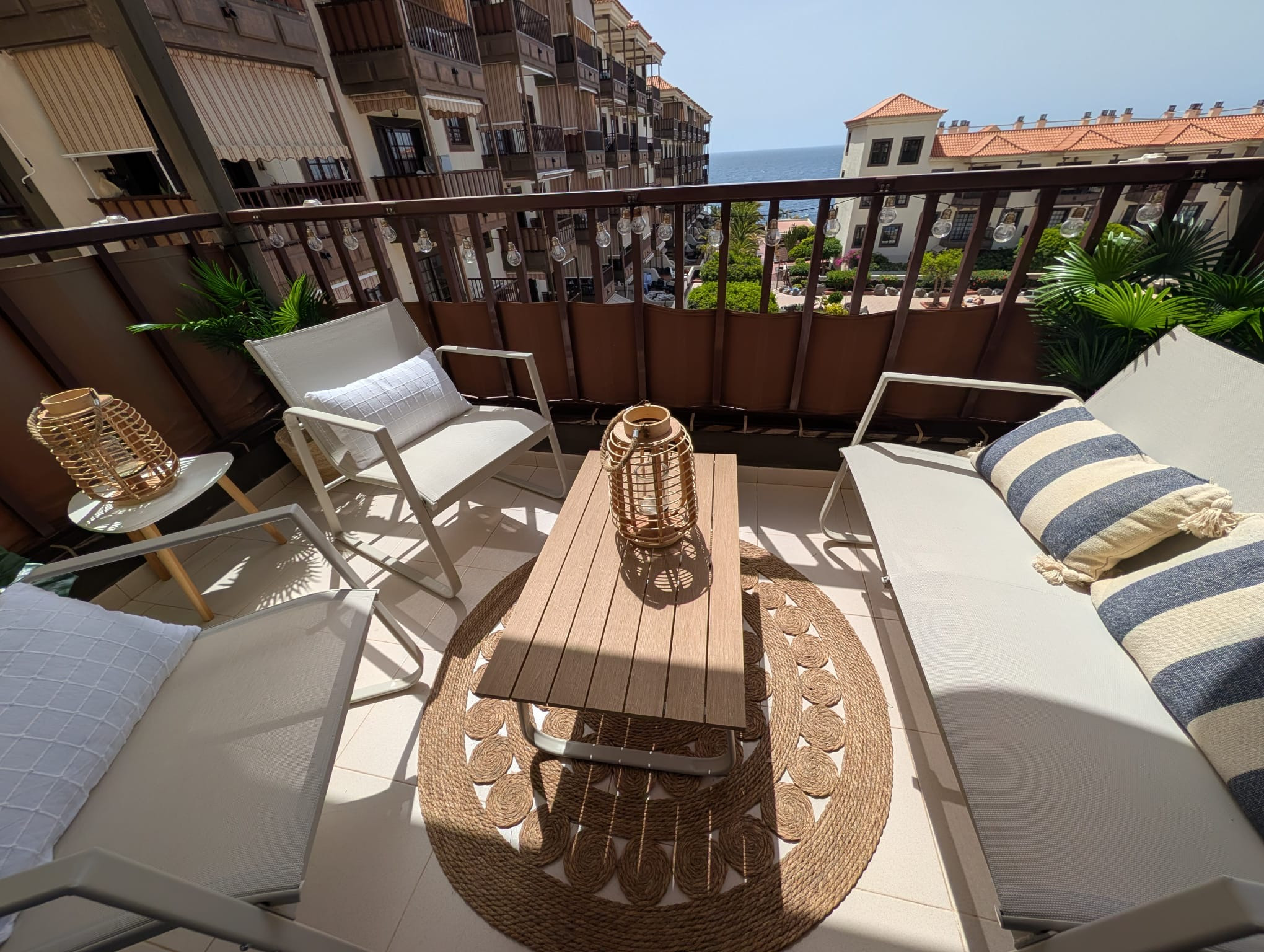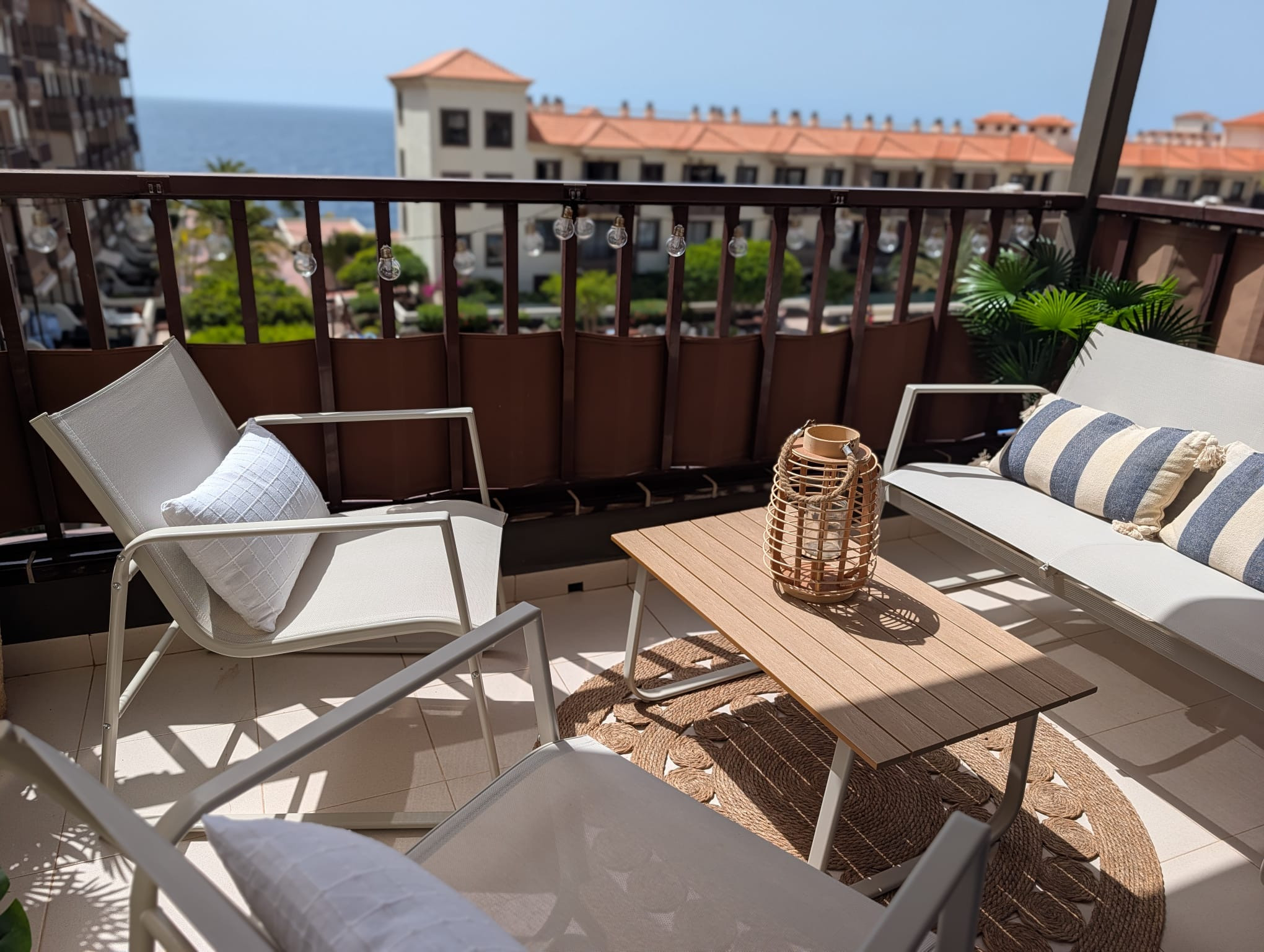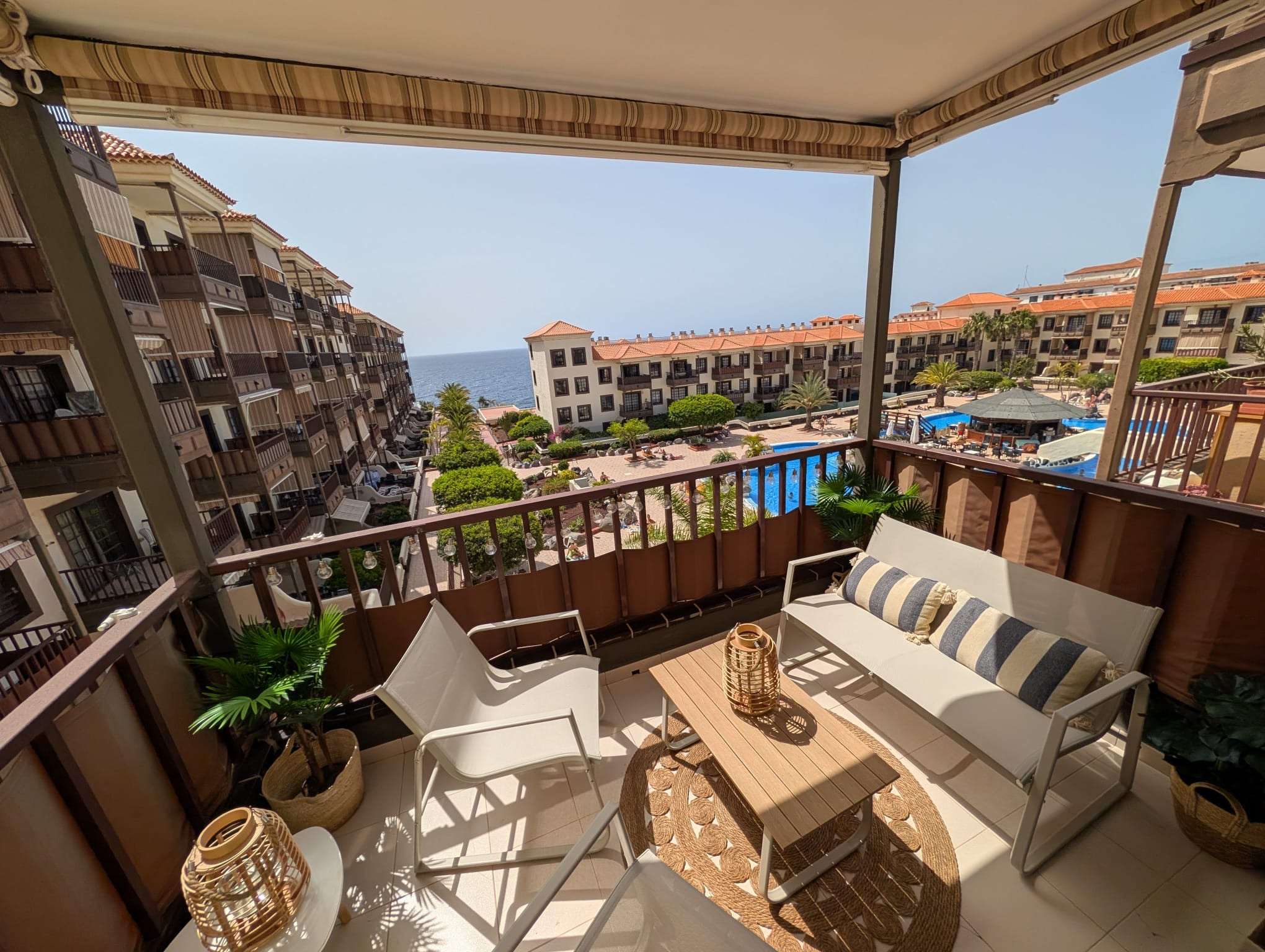 The apartment is is ample, and is 50 m². It has views of waterfront and the swimming pool.