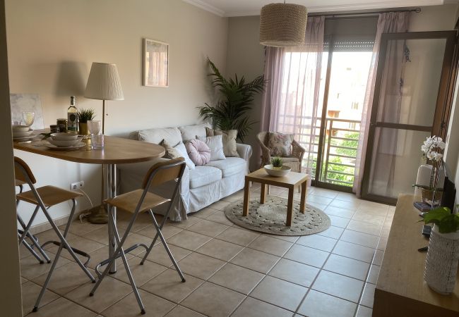 The accommodation is in a quiet complex, with a large swimming pool. It has a comfortable bedroom with a large wardrobe and fan, a bathroom with a washing machine and a living-dining room with a fairly well-equipped kitchen with all the necessary utensils to have a very pleasant stay. Also from the living room you have access to a balcony overlooking the pool where you can have breakfast enjoying the surroundings or prepare your dinners at dusk in a more romantic way.
